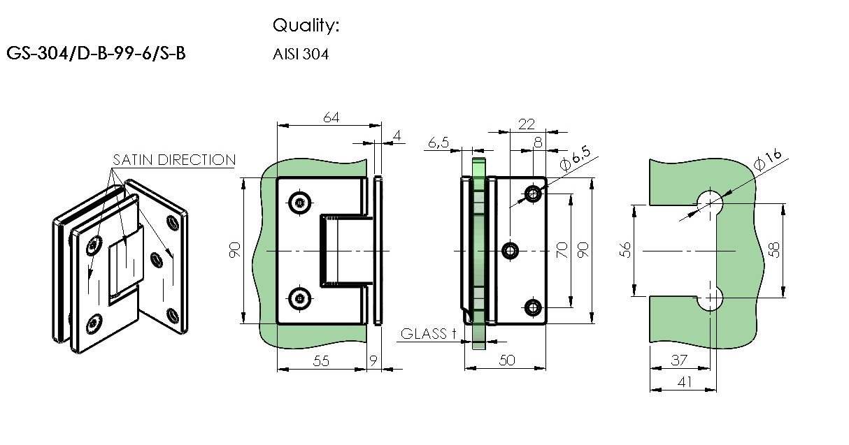 Finisajul satinat ii confera un aspect elegant si rafinat, integrandu-se armonios in orice tip de interior. Este compatibila cu sticla avand grosimi intre 8 si 10 mm, necesitand gaurirea acesteia pentru o instalare stabila si sigura. Poate sustine o greutate maxima de 45 kg la utilizarea a doua balamale, fiind ideala pentru usi din sticla de dimensiuni medii.