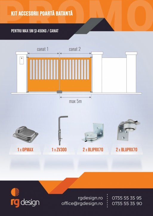 Set complet accesorii poarta batanta, deschidere max 5 m si 400 kg pe canatSet complet accesorii poarta batanta, deschidere max 5 m si 400 kg pe canat